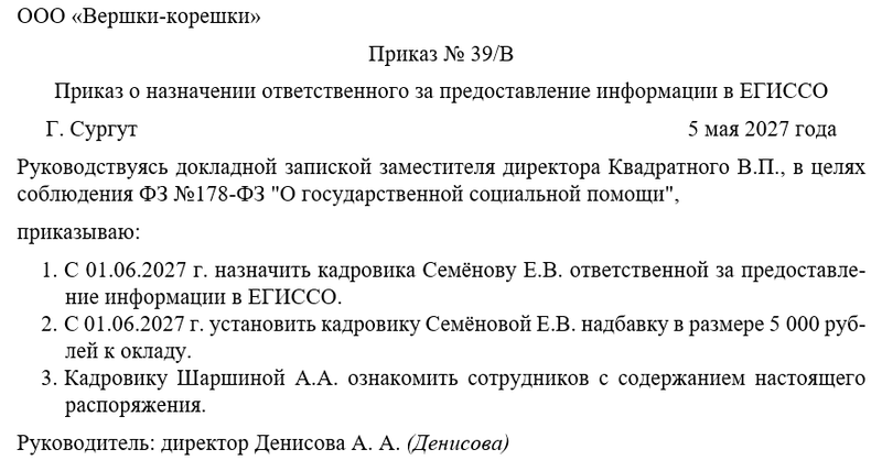 Следующим шагом руководитель объявляет о назначении одного из действующих сотрудников ответственным за предоставление информации в ЕГИССО и работу с системой. Ссылка на нормативную базу обязательна. Также необходимо решить вопрос о том, кто их работников будет следить за исполнением распоряжения. Чаще всего контроль за исполнением распоряжения директор оставляет за собой.