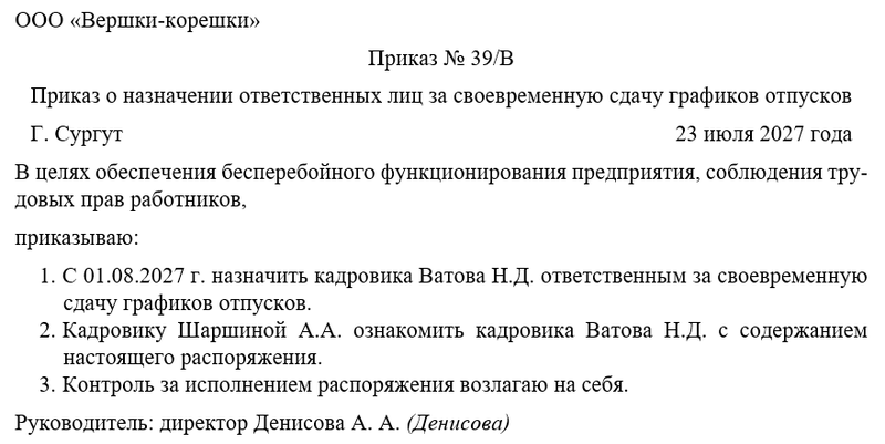 Бланк приказа о назначении ответственных лиц за своевременную сдачу графиков отпусков