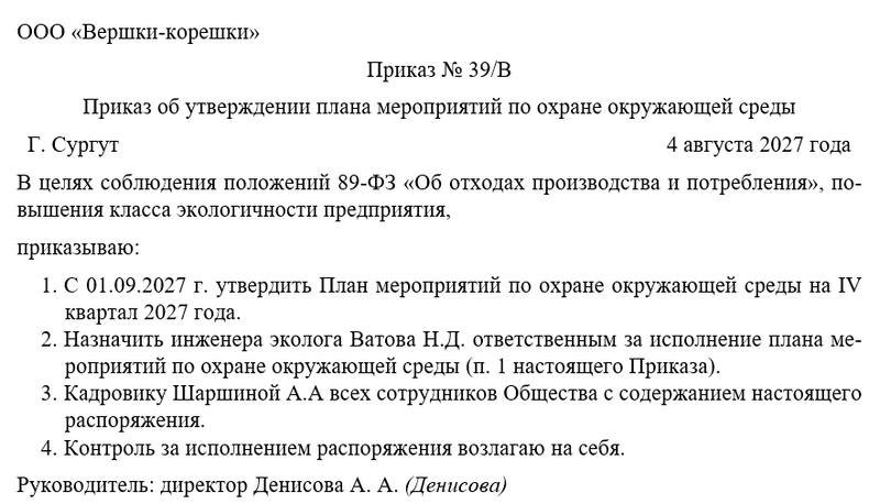 Приказ подписывается руководителем организации, регистрируется и подлежит ознакомлению под личную подпись назначенных ответственных лиц, руководителей заинтересованных структурных подразделений и специалиста по охране окружающей среды. К приказу прилагаются утвержденные Должностные инструкции. Хранится приказ постоянно.