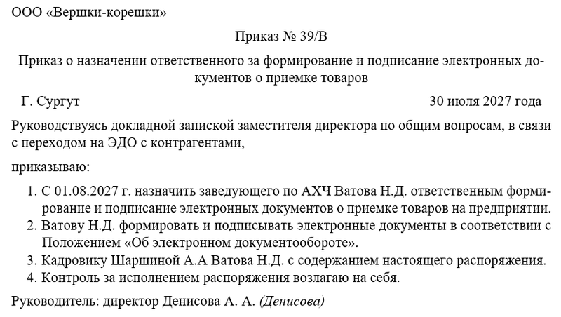 - Назначить ответственными за формирование и подписание электронных документов о приемке товаров (электронных актов приемки) в системе ЭДО [Название системы, например: "Диадок", "СБИС", "Контур.Диадок"] следующих сотрудников: [ФИО 1], [Должность 1]; [ФИО 2], [Должность 2].