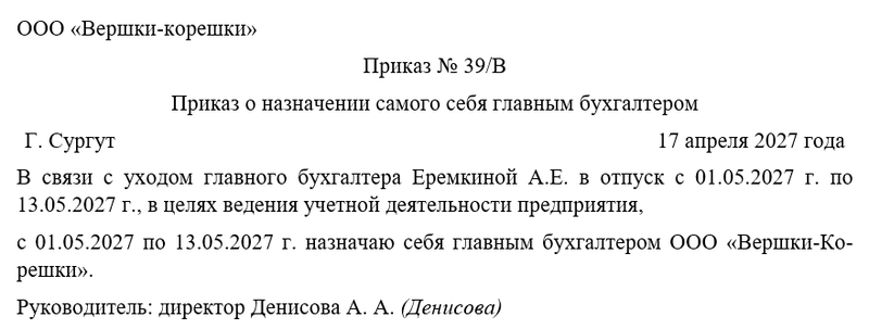 Следующим шагом руководитель объявляет самого себя главным бухгалтером. Чаще всего контроль за исполнением распоряжения директор оставляет за собой.