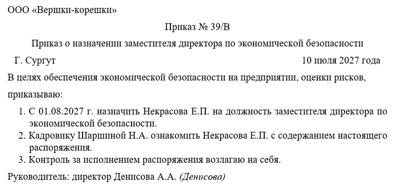 Скачать в КонсультантПлюсБесплатный доступ к документуОбразец приказа о назначении заместителя директора по экономической безопасности