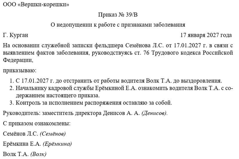 Приказ о недопущении к работе с признаками заболевания – это распорядительный документ, в соответствии с которым руководитель организации имеет право отстранить своего работника от трудовой деятельности в связи с тем, что у него выявлены некоторые болезненные симптомы. Сегодня мы разберемся, для какой категории сотрудников важно состояние здоровья в моменте, почему этому придается такое значение и как правильно сформировать соответствующее распоряжение.