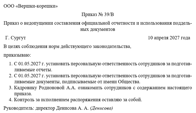 Следующим шагом руководитель объявляет о недопущении составления неофициальной отчетности и использования поддельных документов, а также назначает человека, который будет осуществлять контроль. Чаще всего контроль за исполнением распоряжения директор оставляет за собой.