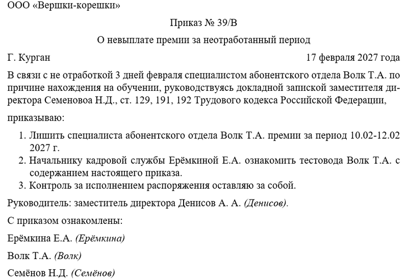 Приказ о невыплате премии за неотработанный период – это распорядительный документ, в соответствии с которым руководитель компании может принять решение о том, что за период времени, когда сотрудник фактически отсутствовал на своём рабочем месте, премия ему не полагается. Сегодня мы разберемся, что представляет собой премиальное вознаграждение за труд, полагается ли сотрудникам премия за период, когда они не находились на предприятии, причем здесь распоряжение директора и как правильно его оформить.