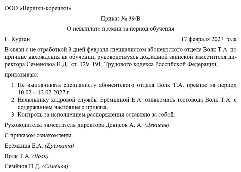 Приказ о невыплате премии за период обучения – это распорядительный документ, в соответствии с которым руководитель компании имеет возможность принять решение о том, чтобы не выплачивать своему сотруднику премиальные средства за период прохождения им обучения. Сегодня мы разберемся, насколько законно лишать работников премии за время нахождения на обучении, можно ли пересчитать премиальные по дням, как составить соответствующий приказ начальника и зачем он вообще нужен.