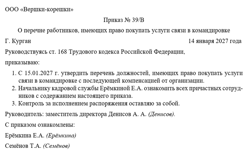 - с такого-то числа утвердить перечень работников, имеющих право покупать услуги связи в командировке (Приложение №1);