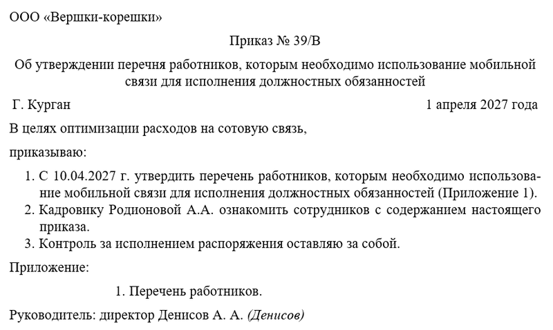 Бланк приказа о перечне работников, которым необходимо использование мобильной связи