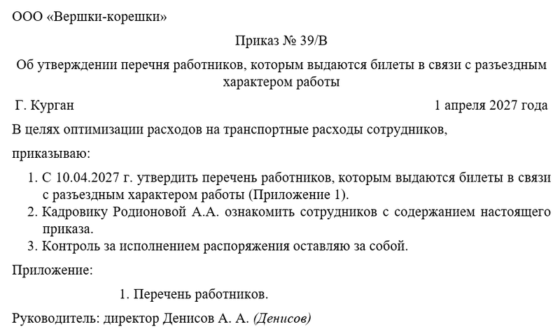 Приказ генерального директора является ключевым документом, юридически закрепляющим перечень должностей с разъездным характером работы. В приказе указываются: обоснование производственной необходимости; полный список должностей с указанием подразделений; виды транспортных билетов (проездные на общественный транспорт, такси, междугородний транспорт); лимиты расходов; порядок возмещения транспортных расходов.