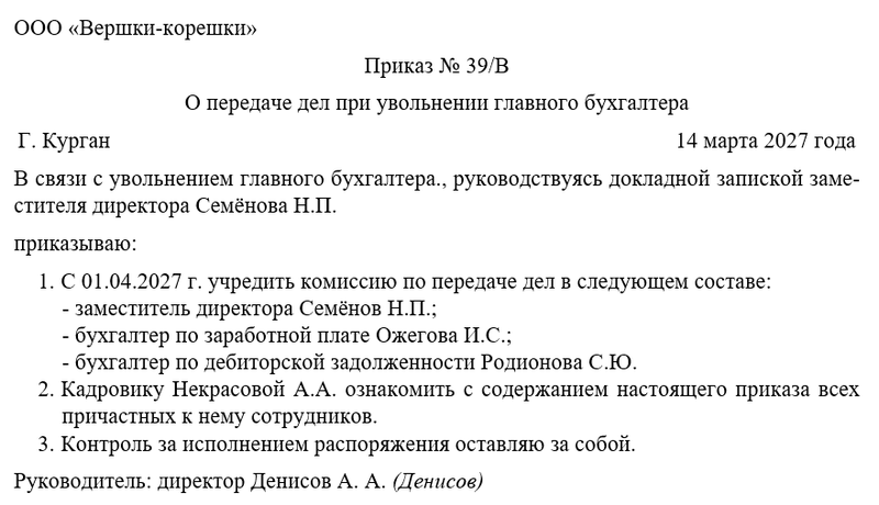 - с такого-то числа начать процедуру по передаче дел при увольнении главбуха;