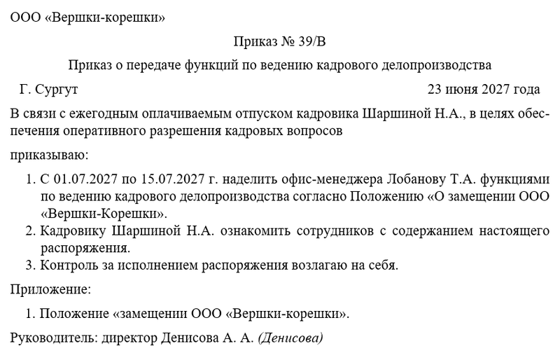 Передача функций кадрового делопроизводства требуется при расширении штата или реорганизации компании. Основанием может стать длительное отсутствие основного ответственного сотрудника. Функции могут быть возложены на заместителя руководителя или начальника юридического отдела. Допускается передача обязанностей старшему специалисту по кадрам или секретарю.