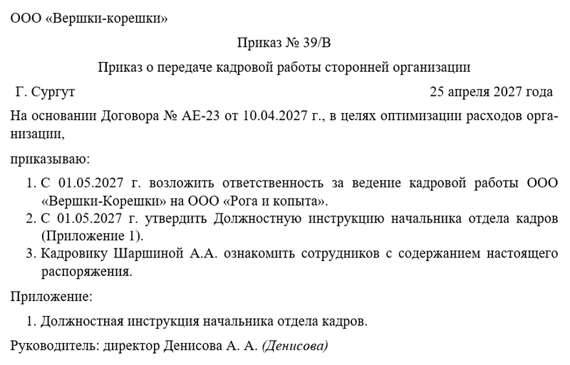Скачать в КонсультантПлюсБесплатный доступ к документуОбразец приказа о передаче кадровой работы сторонней организации