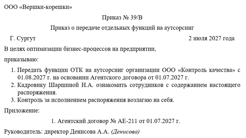 Приказ о передаче отдельных функций на аутсорсинг – это распорядительный документ, в соответствии с которым руководитель предприятия принимает решение о перераспределении части ответственности внутри своей компании. Передачи части функций на аутсорсинг – стандартная практика в современном мире.