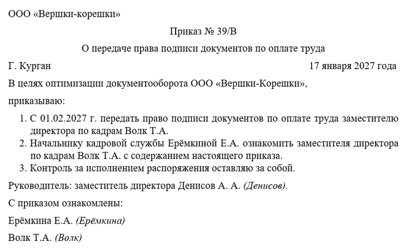 Для того чтобы делегировать право подписи, директор должен будет издать соответствующий приказ. С числа, когда распоряжение вступит в силу, сотрудник получит право подписывать зарплатную документацию от лица компании.