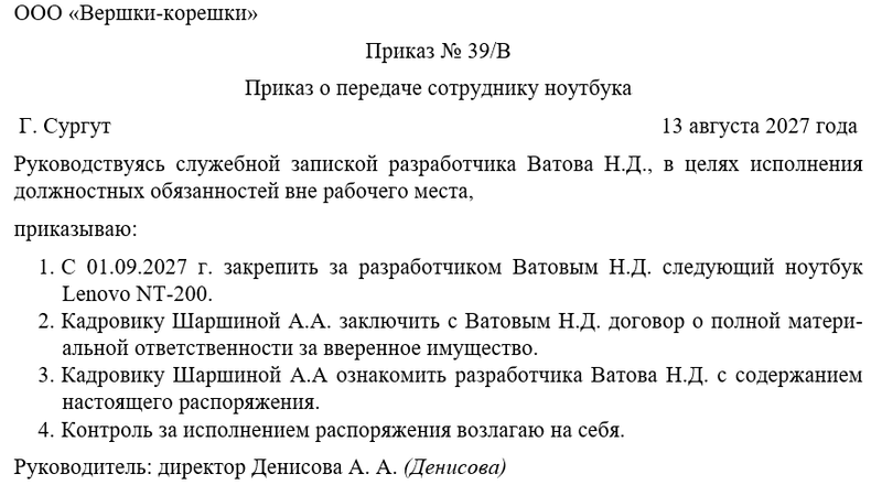 Оформление приказа начинается с указания его наименования, даты и номера. Вводная часть содержит основание передачи ноутбука, данные работника и его должность. Далее приводятся точные характеристики техники, включая марку, модель, серийный номер и техническое состояние. Формулировки должны исключать двусмысленность и подмену оборудования.