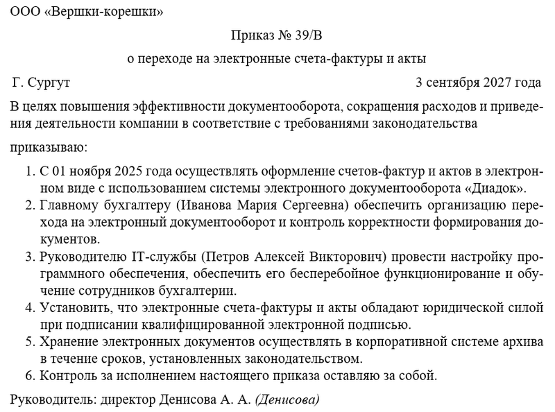 Приказ должен содержать четкое распоряжение о переходе компании на использование электронных счетов-фактур и актов. Определяется дата начала применения новых правил и список подразделений, участвующих в процессе.