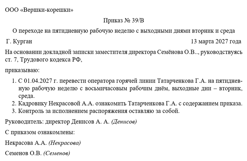 - с такого-то числа перевести таких-то сотрудников или одного сотрудника организации на пятидневную рабочую неделю с выходными днями вторник и среда;
