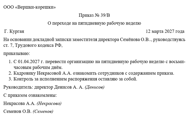 Распоряжение директора о переходе на пятидневную рабочую неделю нужно для того, чтобы придать всей процедуре официальный характер. Приказ должен быть издан официально, а каждый сотрудник компании, которого затронет переход на пятидневную неделю, – ознакомиться с содержанием настоящего распоряжения под роспись. После того как все этапы будут пройдены, можно будет сказать, что предприятия в полной мере перешло на новый формат трудового дня.