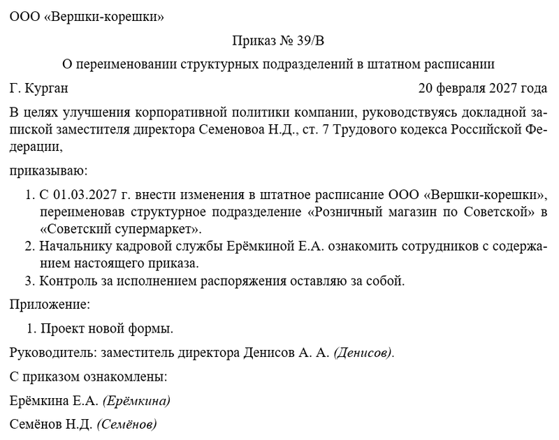 - с такого-то числа переименовать структурные подразделения в штатном расписании компании;