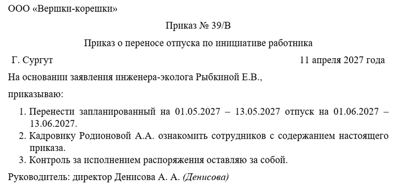 Следующим шагом руководитель объявляет о переносе периода отпуска работника по его инициативе, а также назначает человека, который будет осуществлять контроль. Чаще всего контроль за исполнением распоряжения директор оставляет за собой.