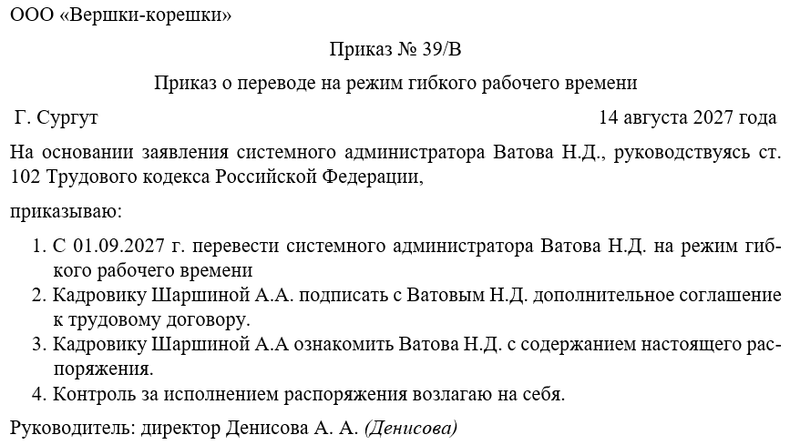 Скачать в КонсультантПлюсБесплатный доступ к документуОбразец приказа о переводе сотрудника на режим гибкого рабочего времени
