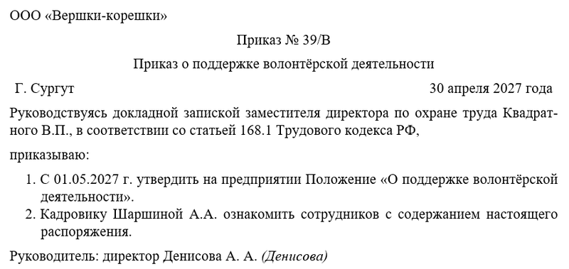 Следующим шагом руководитель объявляет об утверждении Положения «О поддержке волонтёрской деятельности». Также необходимо решить вопрос о том, кто их работников будет следить за исполнением распоряжения. Чаще всего контроль за исполнением распоряжения директор оставляет за собой.