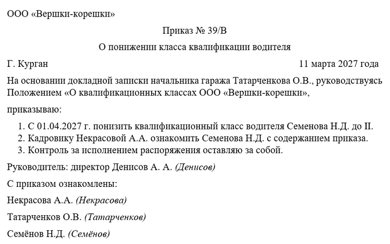 Для того чтобы принять решение о понижении класса, у директора на руках должны быть достаточные для этого основания. Например, речь может пойти о докладной записке начальника гаража, который довёл бы до сведения информацию о каких-то нарушениях.