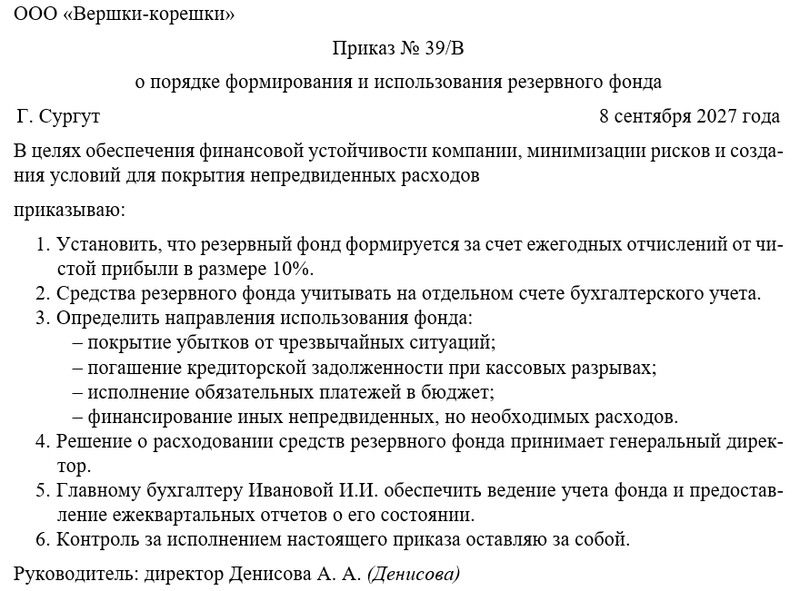 Приказ о порядке формирования и использования резервного фонда должен четко фиксировать ключевые правила.
