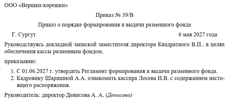 Следующим шагом руководитель объявляет об утверждении регламента формирования и выдачи разменного фонда. Ссылка на нормативную базу обязательна. Также необходимо решить вопрос о том, кто их работников будет следить за исполнением распоряжения. Чаще всего контроль за исполнением распоряжения директор оставляет за собой.