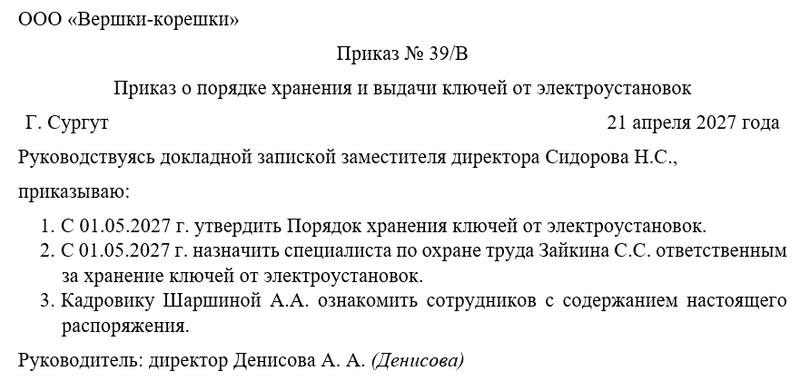 Следующим шагом руководитель объявляет об утверждении порядка хранения и выдачи ключей от электроустановок, назначает ответственного сотрудника за воплощение данных мероприятий в жизнь. Также необходимо решить вопрос о том, кто их работников будет следить за исполнением распоряжения. Чаще всего контроль за исполнением распоряжения директор оставляет за собой.
