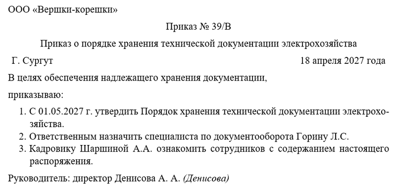 Скачать в КонсультантПлюсБесплатный доступ к документуОбразец приказа о порядке хранения технической документации электрохозяйства