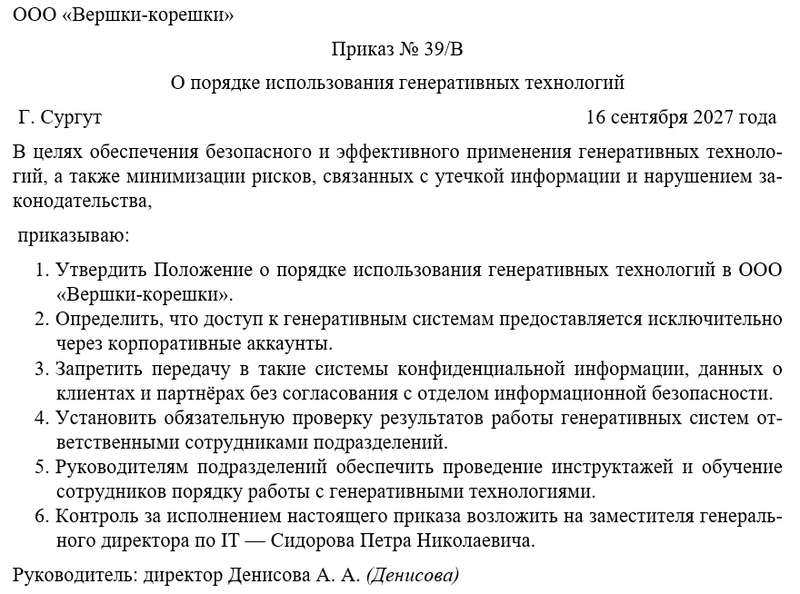 Именно поэтому введение приказа о порядке использования генеративных технологий является необходимым шагом. Он устанавливает единые правила работы с такими инструментами, предотвращает злоупотребления и формирует культуру ответственного применения современных решений в интересах компании.