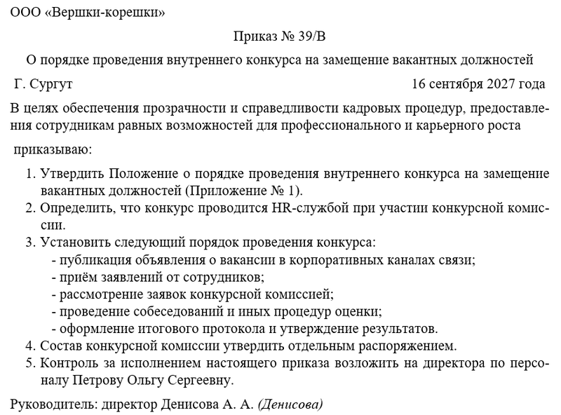 Приказ о порядке проведения внутреннего конкурса на замещение вакантных должностей является инструментом справедливого и открытого кадрового отбора. Он способствует росту мотивации сотрудников, укреплению корпоративной культуры и развитию кадрового резерва.