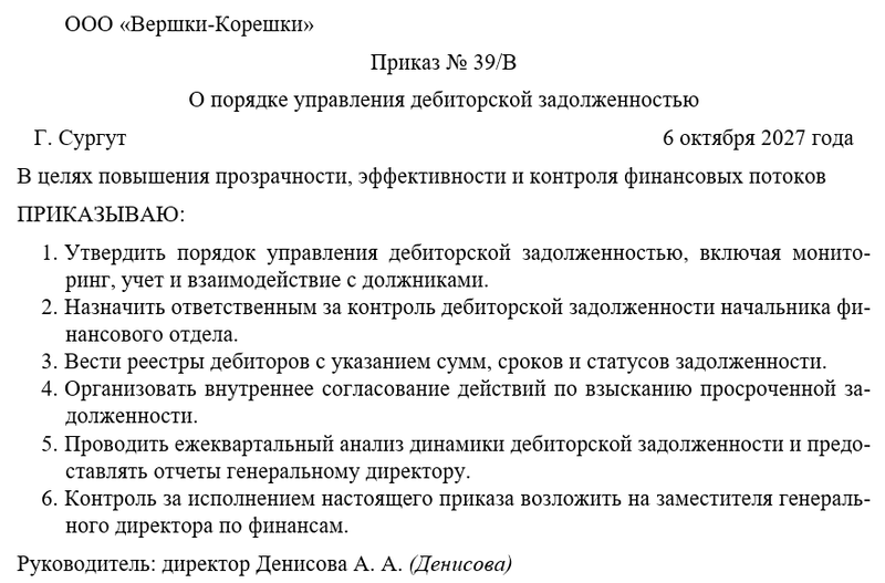 Приказ о порядке управления дебиторской задолженностью — это официальный управленческий документ, закрепляющий внутренние правила учета, контроля и взаимодействия с должниками компании. Цель приказа заключается в систематизации работы с дебиторской задолженностью, снижении финансовых рисков, повышении ликвидности и улучшении планирования денежных потоков.
