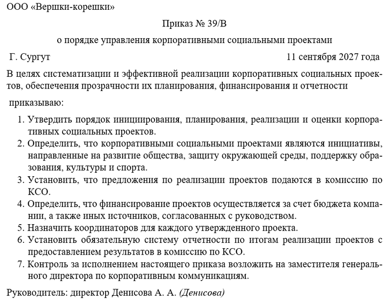 Также приказ закрепляет распределение обязанностей между подразделениями. Например, HR-служба отвечает за вовлечение персонала в социальные проекты, отдел PR — за информационное сопровождение, финансовый отдел — за учет расходов, а специализированная комиссия — за оценку эффективности инициатив.