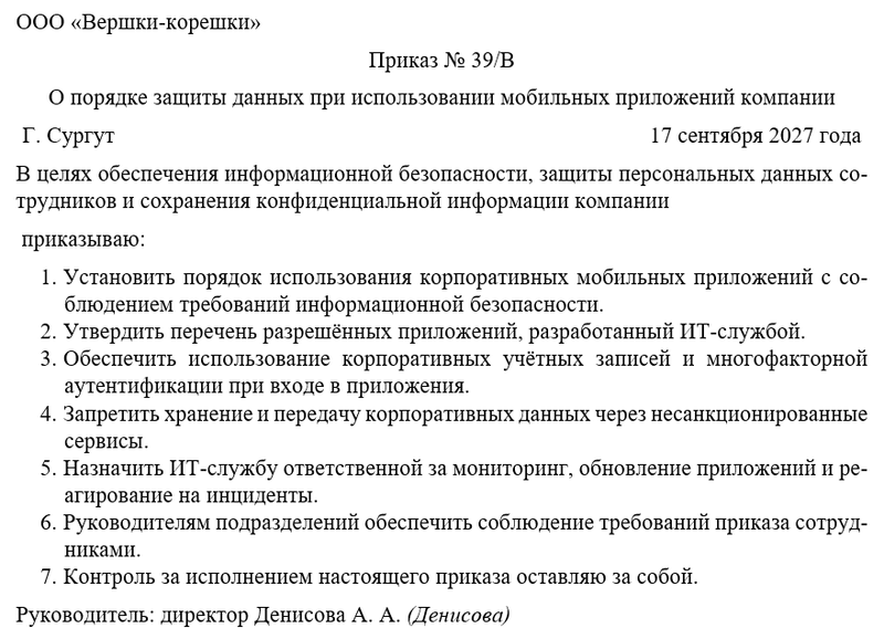 В конечном итоге приказ становится важным элементом корпоративной политики информационной безопасности, формируя культуру ответственного использования мобильных приложений и защищая интересы компании, сотрудников и её партнёров.