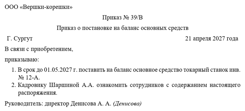 Приказ руководителя является основным документом, подтверждающим ввод объекта в эксплуатацию и его постановку на баланс. В нем указываются наименование ОС, его инвентарный номер, первоначальная стоимость, срок полезного использования и ответственные за учет лица.
