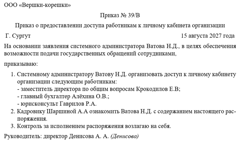 Бланк приказа о предоставлении доступа работникам к личному кабинету организации