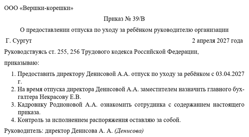 Следующим шагом руководитель объявляет о собственном уходе в отпуск по уходу за ребёнком, назначает своего заместителя на время отсутствия, а также указывает на человека, который будет осуществлять контроль. Чаще всего контроль за исполнением распоряжения директор оставляет за собой.
