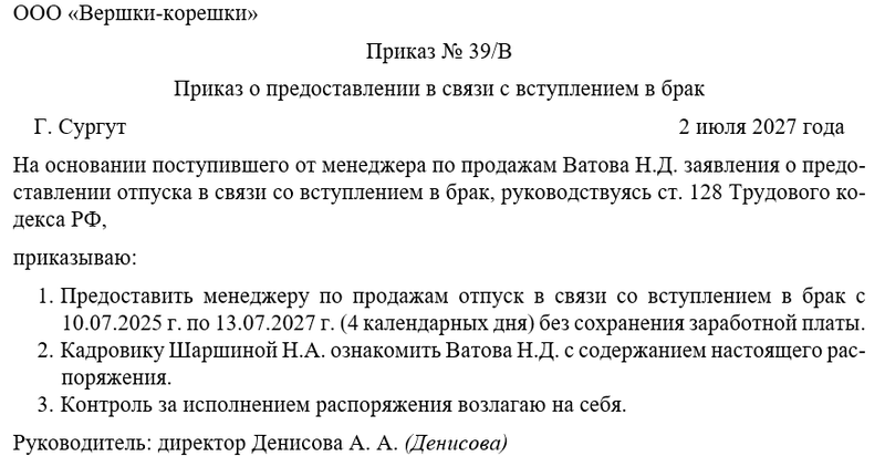 В вводной части указываются полные реквизиты организации и дата составления. Приводятся ссылки на статью 128 ТК РФ и внутренние нормативные акты. Указываются ФИО сотрудника, его должность и структурное подразделение. Конкретизируется основание для отпуска — заявление работника с датой подачи. Упоминается приложенная копия свидетельства о заключении брака.