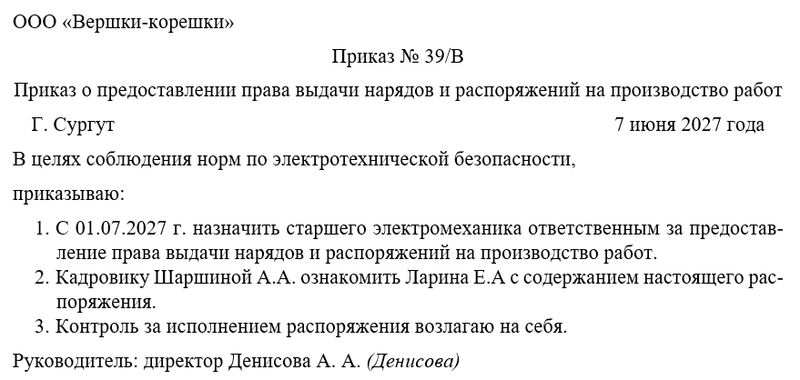 Следующим шагом директор объявляет о назначении одного из сотрудников компании ответственным за выдачу нарядов и распоряжений на производство работ. Также необходимо решить вопрос о том, кто их работников будет следить за исполнением распоряжения. Не забудем назначить одного из сотрудников ответственным за ознакомлением с новым регламентом всех коллег. Это может быть руководитель отдела или целого направления, заместитель директора. Чаще всего контроль за исполнением распоряжения директор оставляет за собой.