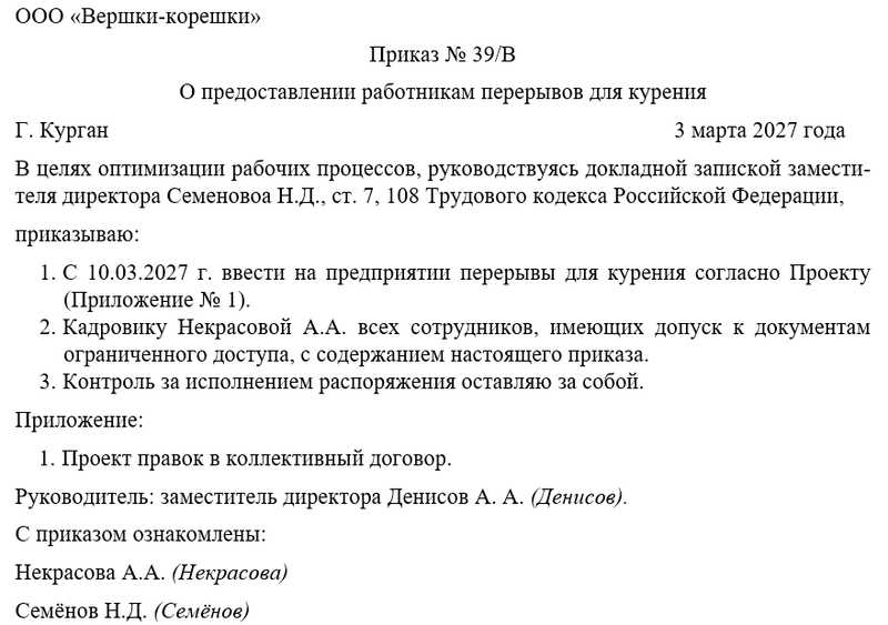 Бланк приказа о предоставлении работникам перерывов для курения