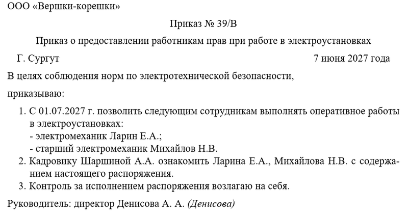 Следующим шагом директор объявляет о предоставлении прав при работе в электроустановках. Также необходимо решить вопрос о том, кто их работников будет следить за исполнением распоряжения. Не забудем назначить одного из сотрудников ответственным за ознакомлением с новым регламентом всех коллег. Это может быть руководитель отдела или целого направления, заместитель директора. Чаще всего контроль за исполнением распоряжения директор оставляет за собой.