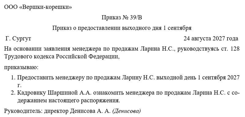 Следующим шагом руководитель объявляет о предоставлении сотруднику выходного дня 1 сентября, в день знаний. Также необходимо решить вопрос о том, кто их работников будет следить за исполнением распоряжения. Чаще всего контроль за исполнением распоряжения директор оставляет за собой.