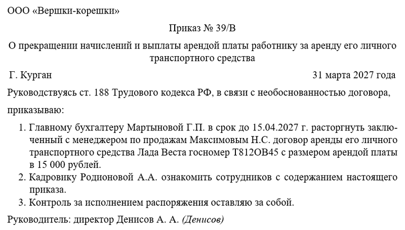 Следующим шагом руководитель объявляет о прекращении заключенного с сотрудником договора аренды транспортного средства, раздает подчинённым соответствующе распоряжения, возлагает ответственность за исполнение приказа, а также назначает человека, который будет осуществлять контроль. Чаще всего контроль за исполнением распоряжения директор оставляет за собой.
