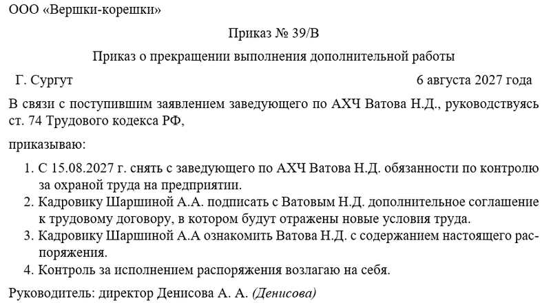 Скачать в КонсультантПлюсБесплатный доступ к документуОбразец приказа о прекращении выполнения дополнительной работы