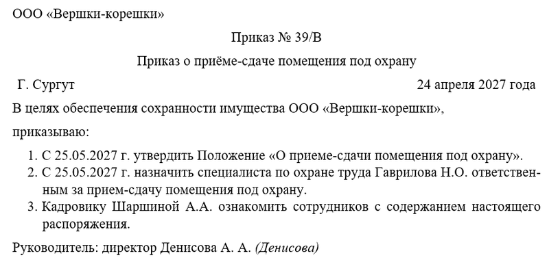 Следующим шагом руководитель объявляет об установлении конкретных правил сдачи-приема помещения под охрану. Сами правила могут быть оформлены в качестве приложения к настоящему приказу. Их разработкой занимаются специалист по охране труда, начальник службы безопасности или непосредственно сам директор. Также необходимо решить вопрос о том, кто их работников будет следить за исполнением распоряжения. Чаще всего контроль за исполнением распоряжения директор оставляет за собой.