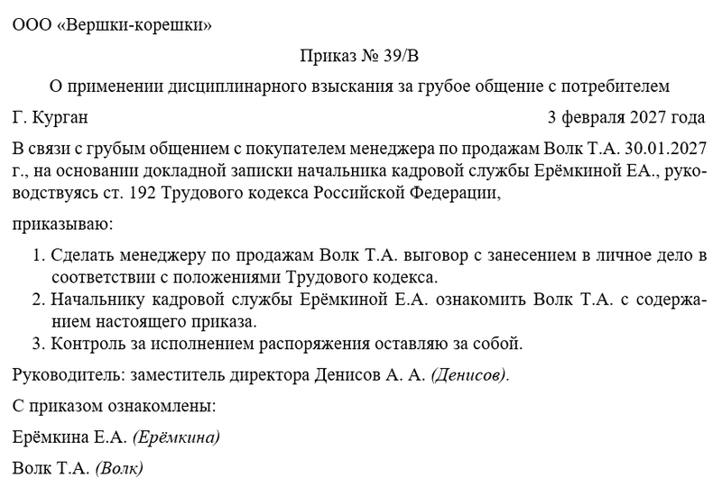 Скачать в КонсультантПлюсБесплатный доступ к документуОбразец приказа о применении дисциплинарного взыскания за грубое общение с потребителем