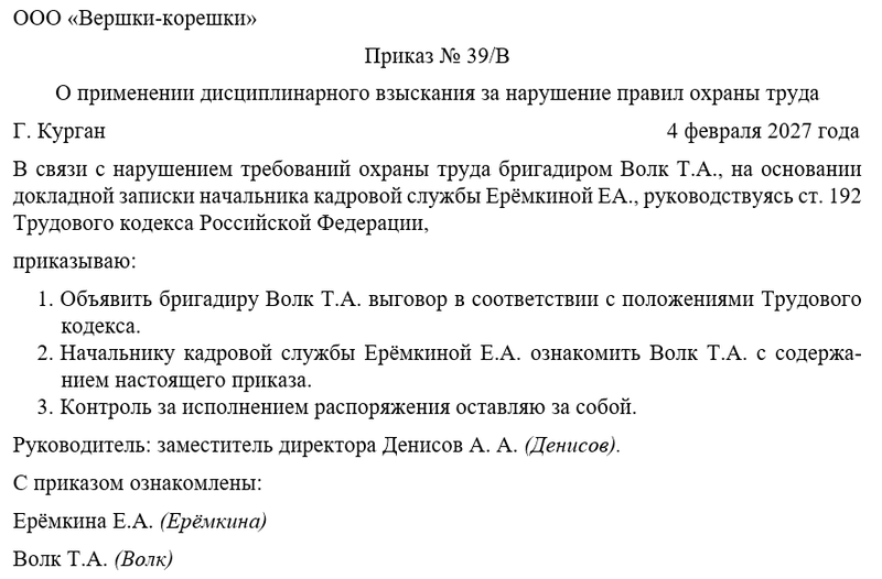 Бланк приказа о применении дисциплинарного взыскания за нарушение правил охраны труда