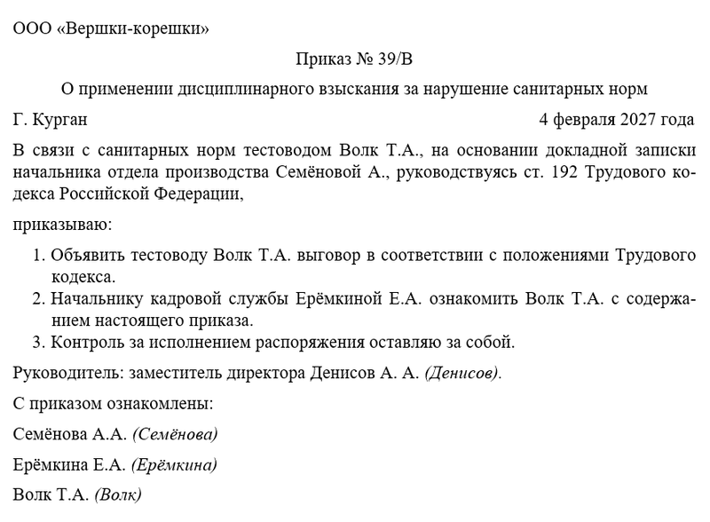 Скачать в КонсультантПлюсБесплатный доступ к документуОбразец приказа о применении дисциплинарного взыскания за нарушение санитарных норм